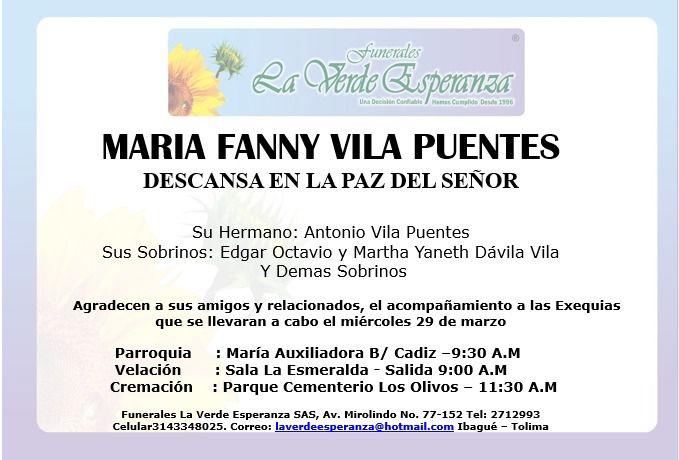 Las exequias de Fanny Vila se cumplirán este miércoles a partir de las 9.30 de la mañana cuando se inicie la homilía en la iglesia María Auxiliadora del barrio Cádiz y luego sus despojos serán trasladados hasta el Parque Cementerio Los Olivos para la cremación.