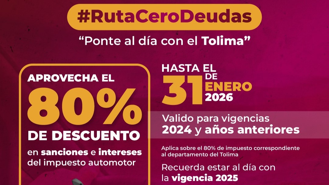 Esta medida hace parte de la campaña Ruta, Cero Deudas: “Ponte al día con el Tolima”, una apuesta del gobierno departamental para facilitar el cumplimiento voluntario de las obligaciones tributarias y fortalecer la cultura de pago en el territorio.
